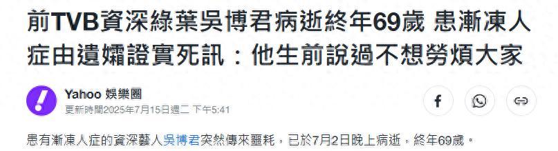 香港娛樂圈又傳噩耗,香港資深綠葉演員吳博君去世,享年69歲。