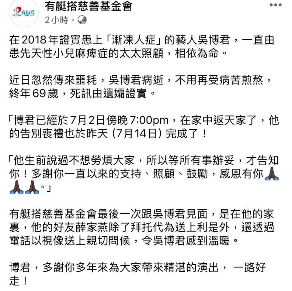 根據該基金會的發文可知,吳博君在7月2日傍晚就去世了,喪禮在7月14日就完成了。