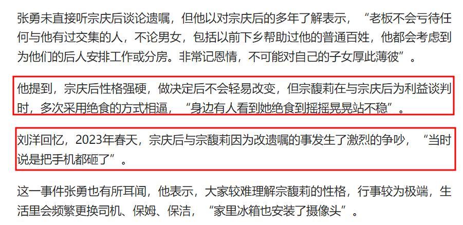 2023年春天,宗慶後因爲修改遺囑的事情與宗馥莉發生了激烈的爭吵,當時他們把手機都砸了。
