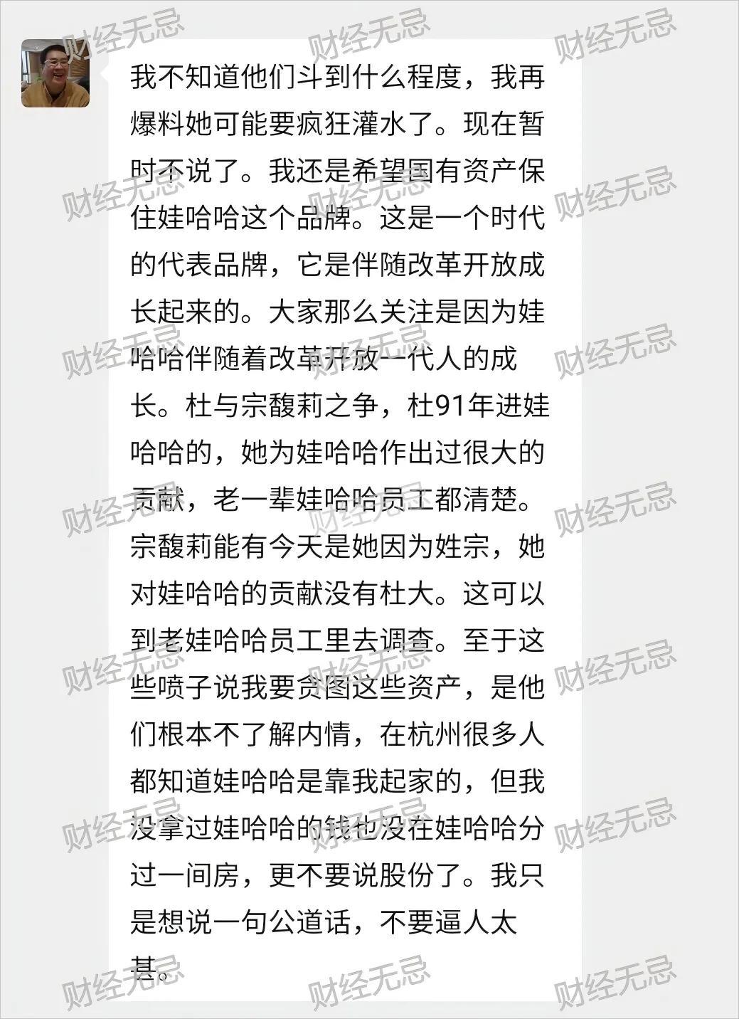 宗澤後還談到了杜建英,他說宗馥莉對娃哈哈的貢獻沒有杜建英大,言外之意就是宗馥莉不如杜建英。