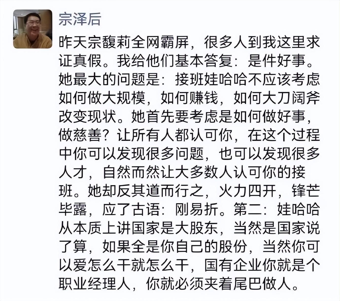 2024年,在宗馥莉鬧辭職時,宗澤後在朋友圈發文說這是件好事,說宗馥莉不應該鋒芒畢露,應該夾着尾巴做人。