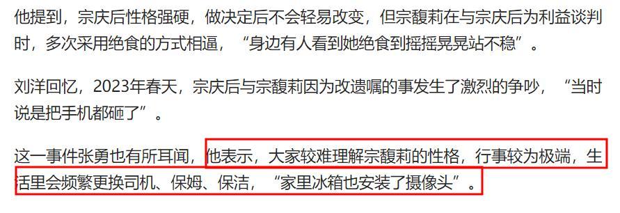 鳳凰網還提到宗馥莉在生活裏會頻繁更換司機、保姆、保潔,“家裏冰箱也安裝了攝像頭”。