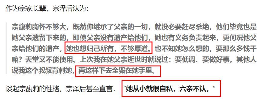 比如,宗馥莉的三叔宗澤後說宗馥莉從小就自私,六親不認,做事不厚道。