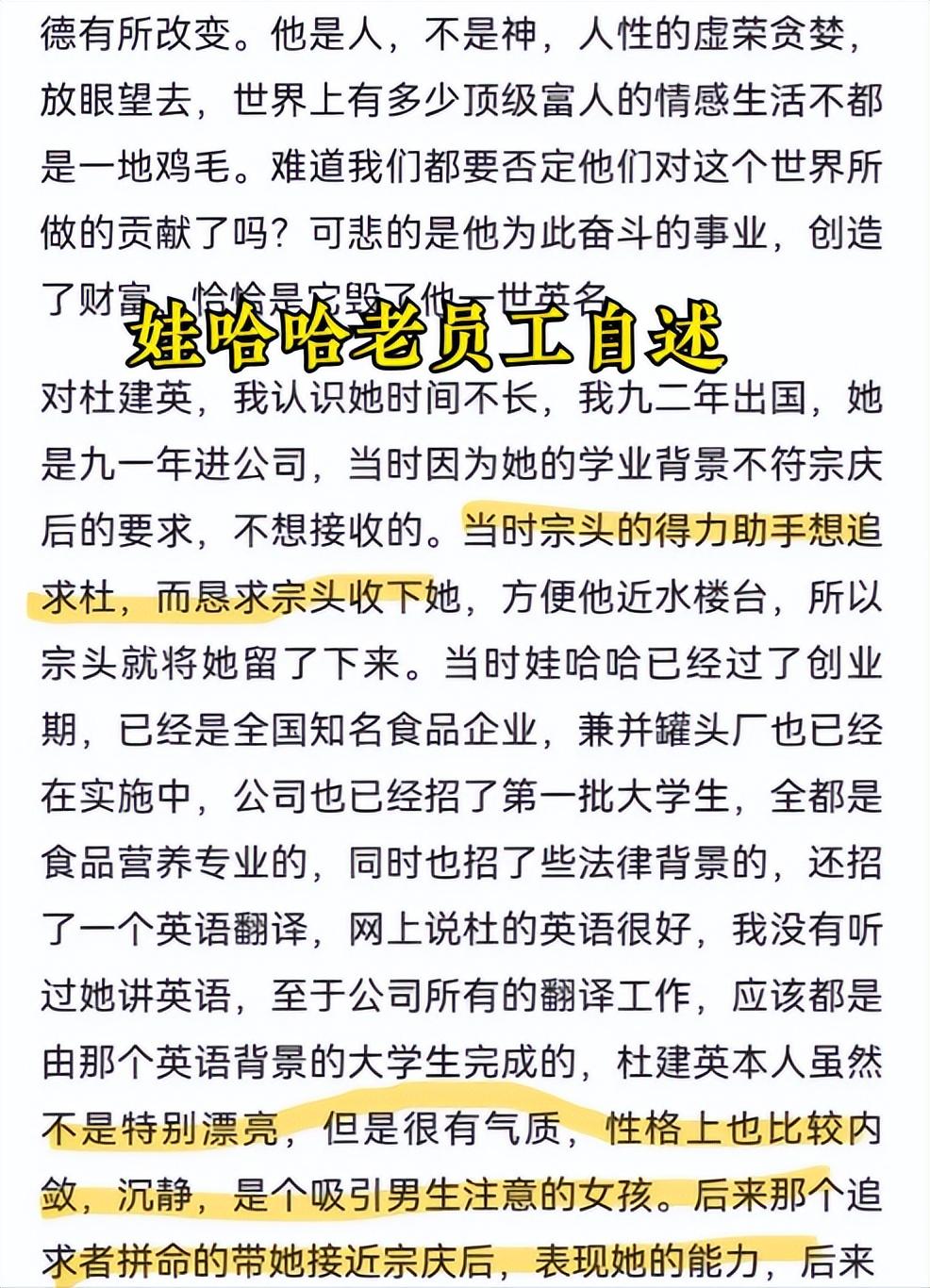 根據娃哈哈一名老員工的發帖可知,當時宗慶後的男助手看中了杜建英,便說服宗慶後讓杜建英入職娃哈哈。