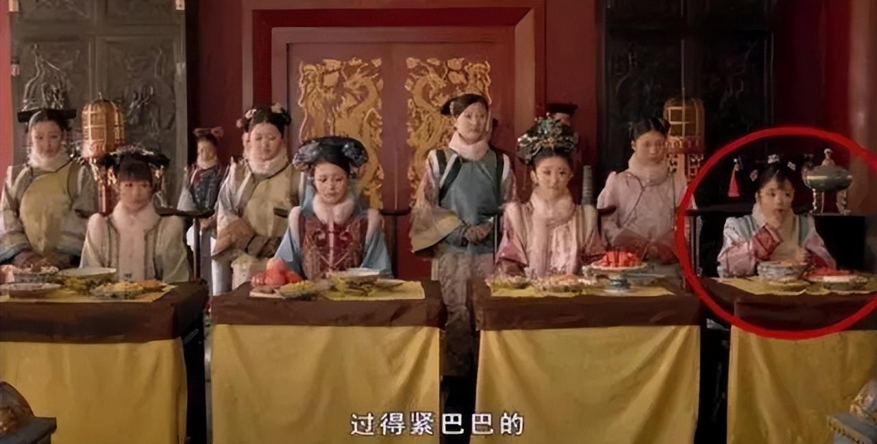 劇裏,妃子們一塊聚餐,別人都端端正正地坐着,就淳常在一直在喫。