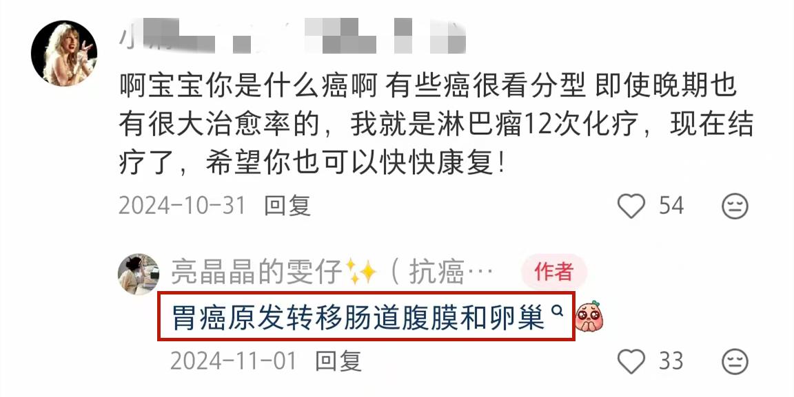 根據張敬雯與網友的互動可知,她是因爲基因突變,得了胃癌原發轉移腸道腹膜和卵巢,並且還是晚期。