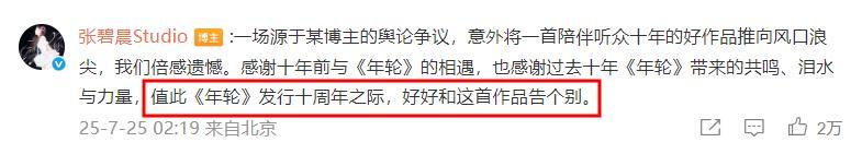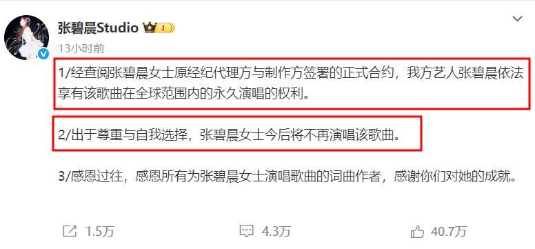 第二點,出於尊重與自我選擇,張碧晨今後將不再演唱《年輪》。