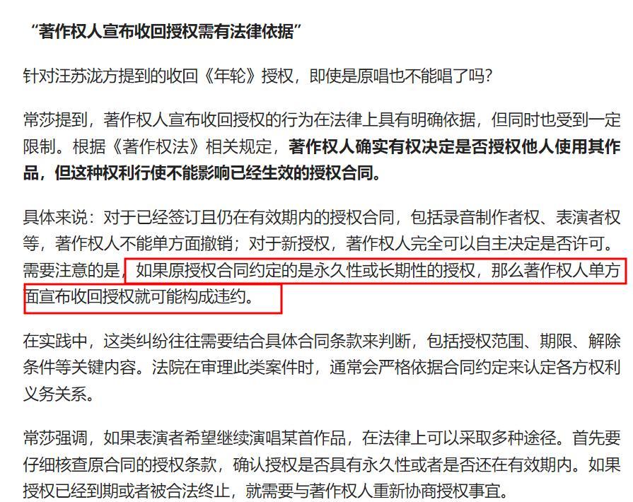 這也就是說如果張碧晨所說簽了《年輪》永久演唱權利的合同爲真,那麼汪蘇瀧說取消授權,他就違約了。