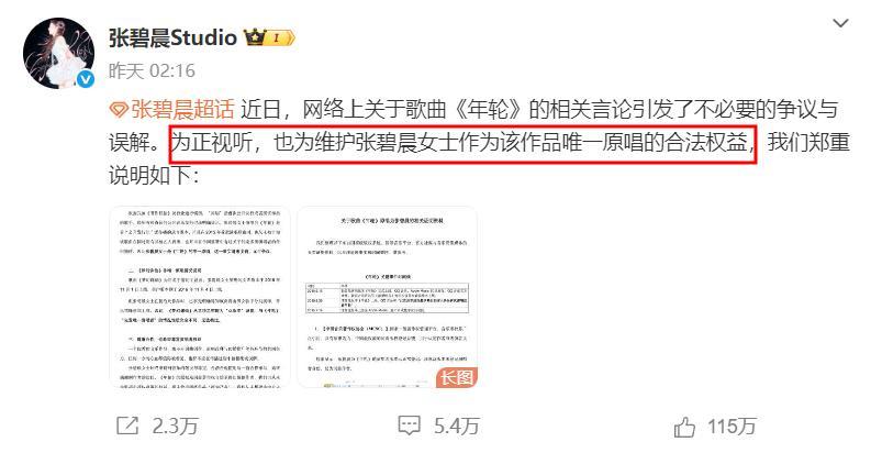 這也就是說,張碧晨即使不爭是否是唯一原唱,根據合同她也擁有《年輪》永久演唱的權利。