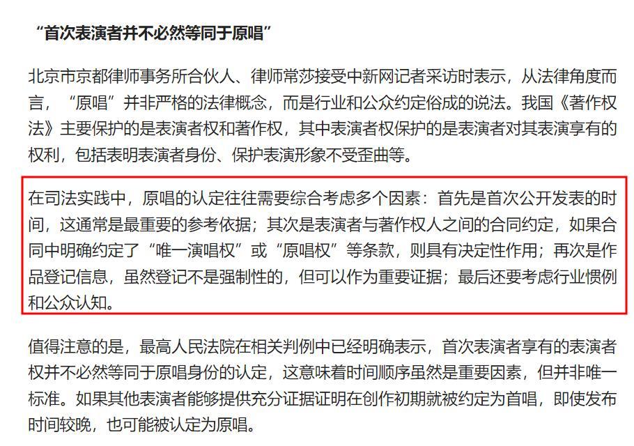 文章提到“首次表演者並不必然等同於原唱”。原唱的認定需要綜合多種因素。