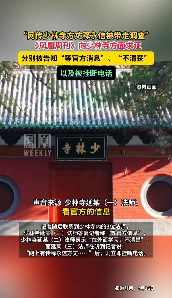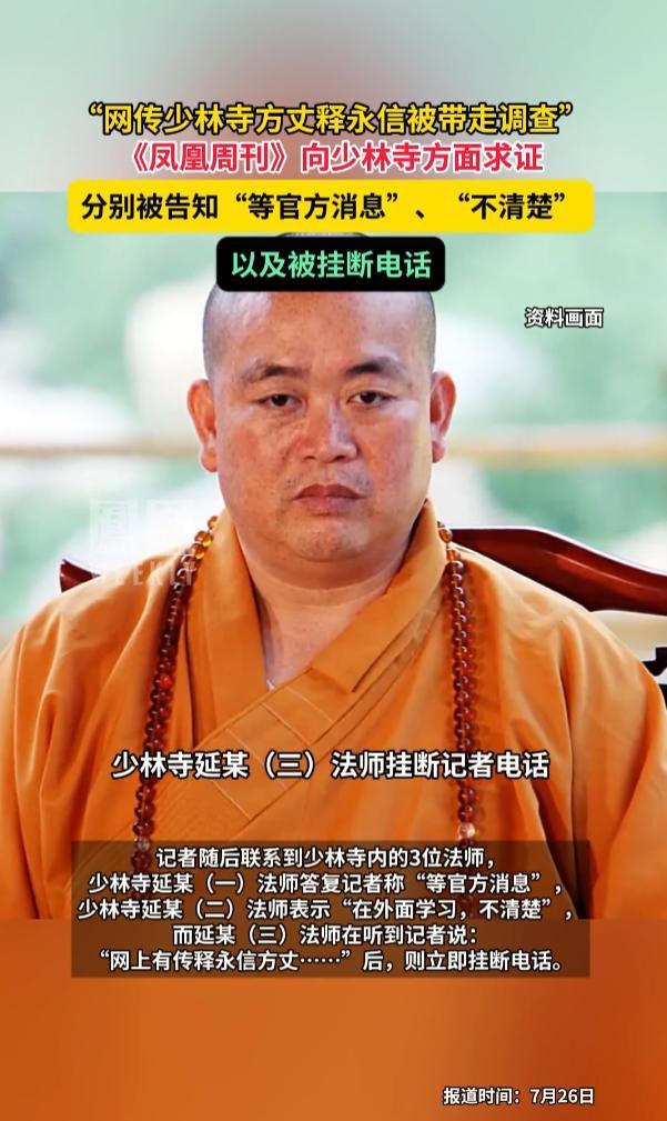 《鳳凰週刊》的記者聯繫上了少林寺的法師延某,問到網上都在傳7月24日下午釋永信方丈被警方帶走,這個消息是真的嗎?