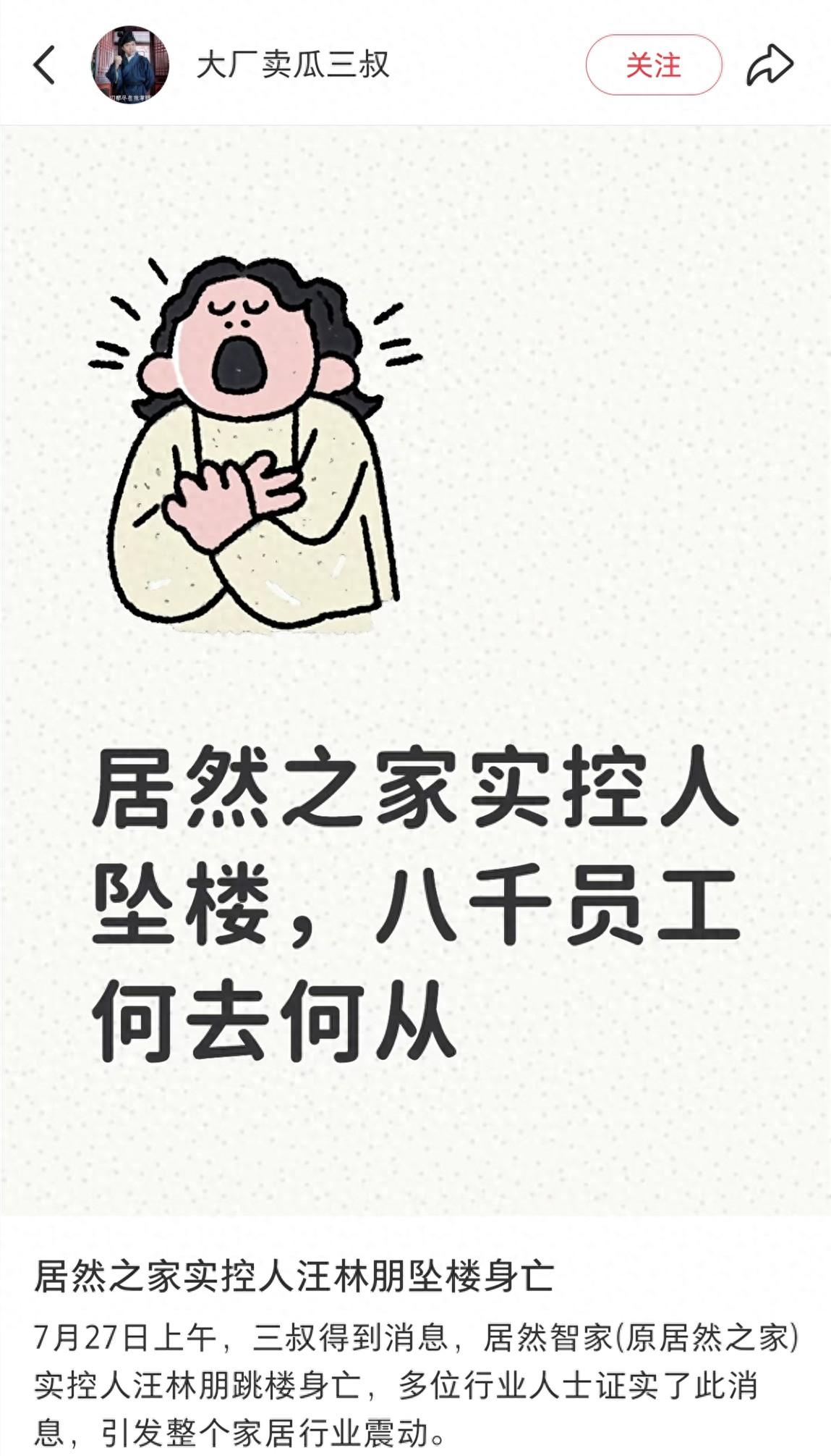 得知此消息之後,筆者也在網絡查詢,發現有居然之家的前員工發文說,還在居然之家工作的同事在朋友圈發文透露了汪林朋跳樓身亡的消息。