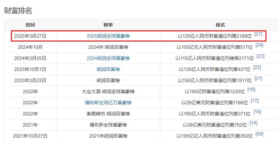 也是在3月,他以125億元的財富位列《2025胡潤全球富豪榜》第2188位。