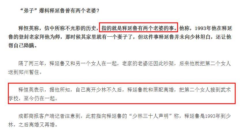 徒弟還說後來釋延魯離開少林寺,就和原配離婚了,隨即與第二個女人結婚了。
