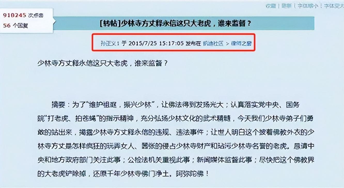 2015年7月25日,一位自稱是少林寺知情人士釋正義的人士在多個論壇發帖,舉報釋永信存在經濟問題、男女關係問題等問題。