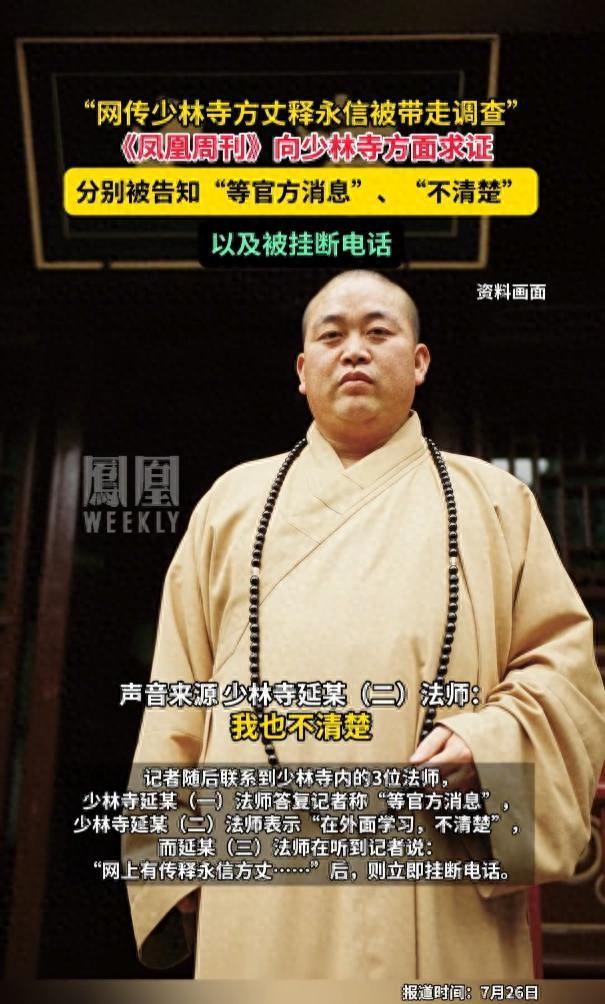 7月26日,網傳少林寺方丈釋永信在7月24日下午被帶走調查。