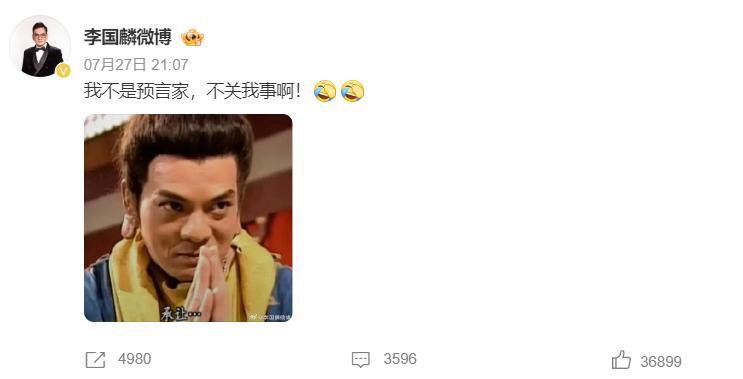 得知此消息後,在深夜李國麟配合網友玩梗,在社交賬號發文:我不是預言家,不關我事啊。並配上了他在《天龍八部》中的劇照。
