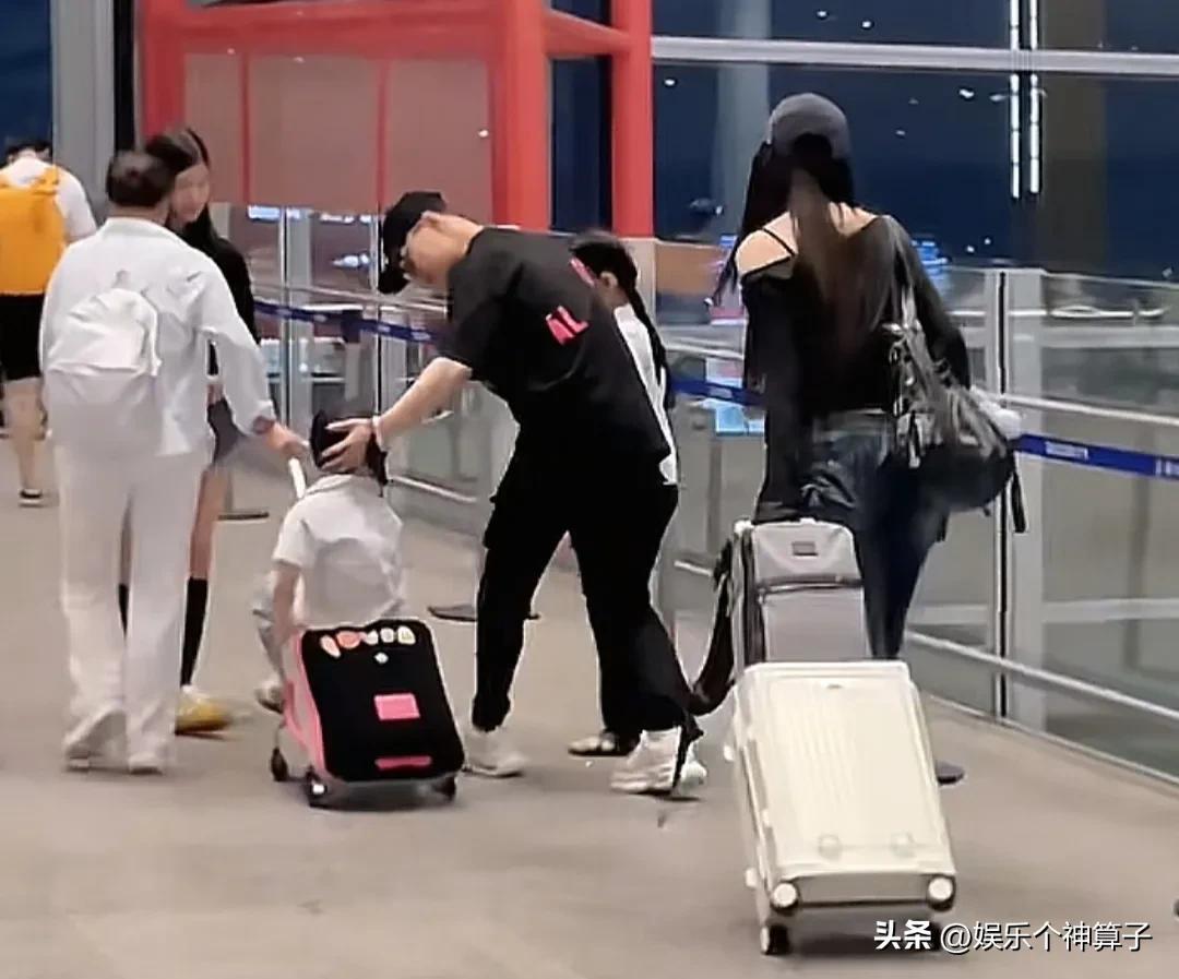 小兒子坐在行李車上,保姆一直照顧,汪峯可能不太放心,一直回頭觀望,這種心情只有當父親的才懂吧!走着走着,立刻停止腳步,用手撫摸兒子的頭,小傢伙年齡不大,卻很懂事,活潑開朗,不吵不鬧,非常聽話。