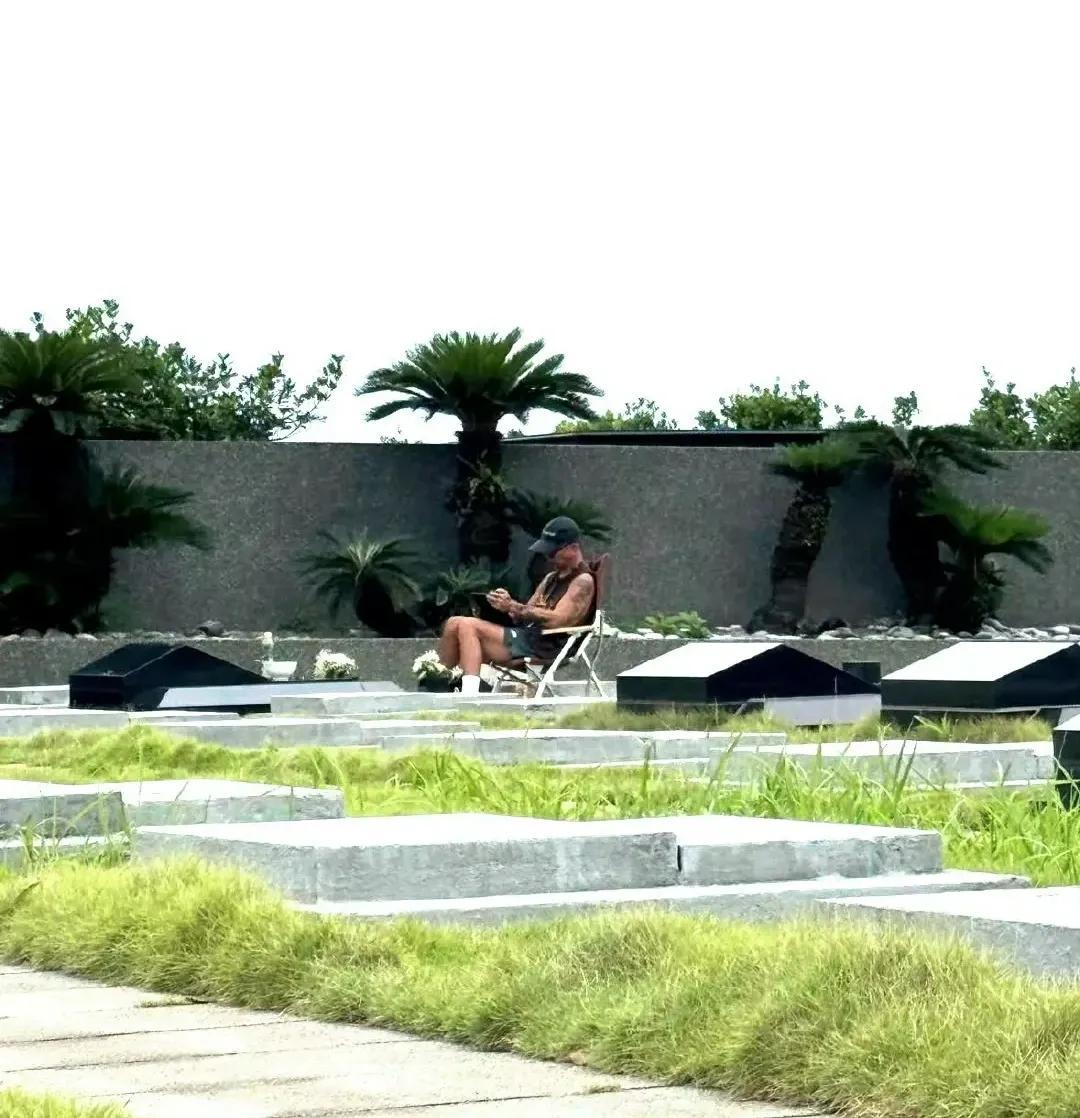 從照片中可以看到具俊曄穿着背心、短褲,戴着棒球帽,坐在大S的墓旁。在這炎熱的季節裏,他頭頂連一把遮陽傘也沒有。
