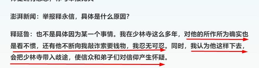 不過釋延魯不認可這一說法,他說他主要是看不慣釋永信的所作所爲,認爲他再這樣下去,會將少林寺帶入歧途,使信衆和弟子們對信仰產生懷疑。