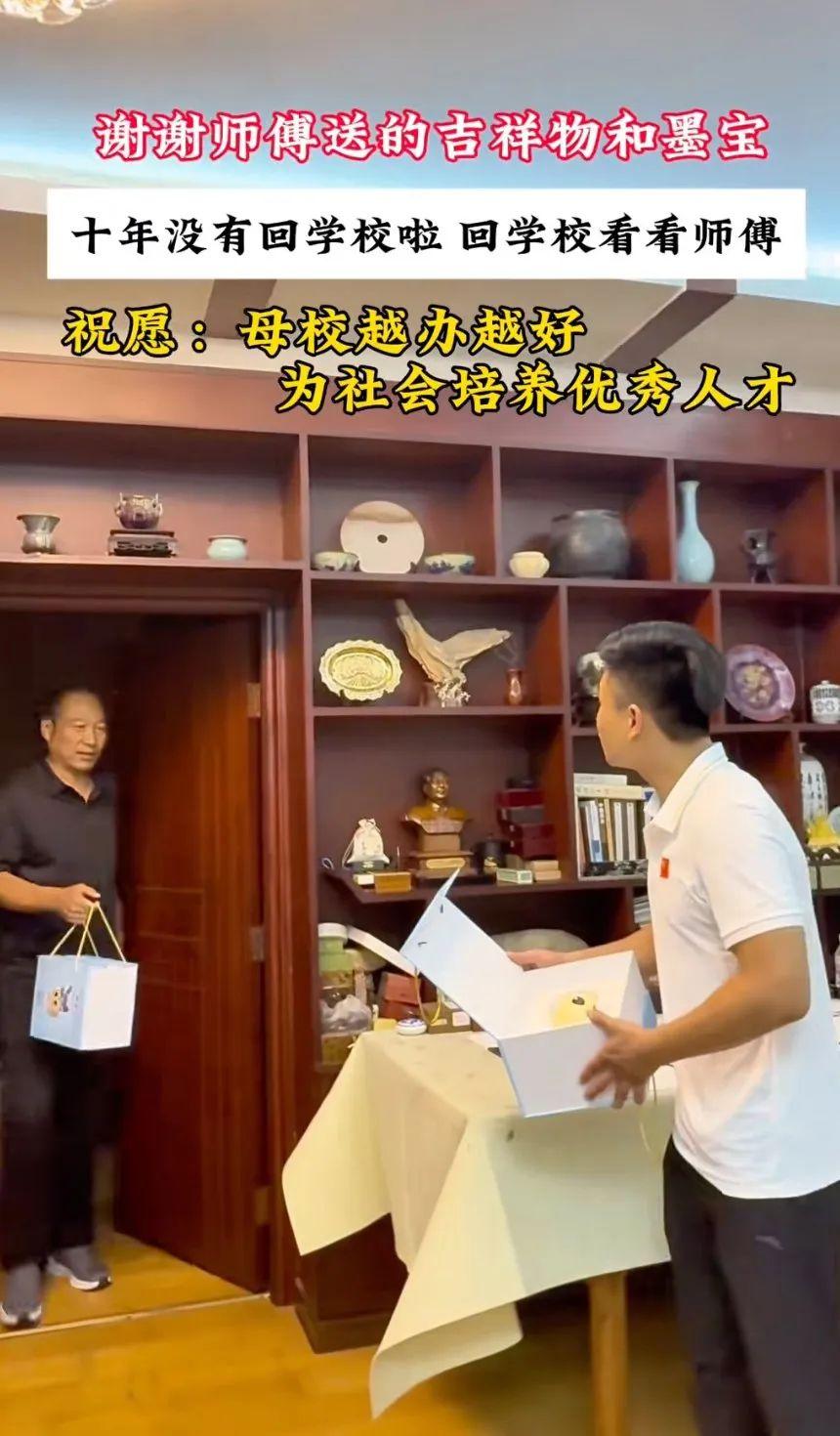 從視頻中可以看到見到曾經的學生,釋延魯非常高興,他不是送禮物,就是送書法作品。