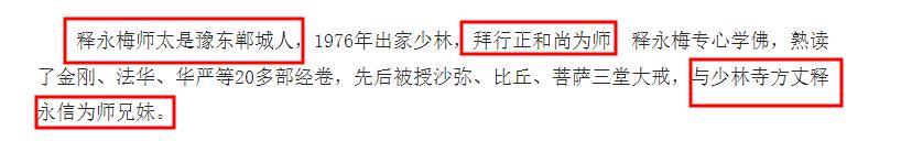 釋永梅師太是行正方丈的徒弟,和釋永信是師兄妹關係,並且釋永梅師太也不是安徽人,她是豫東鄲城人。