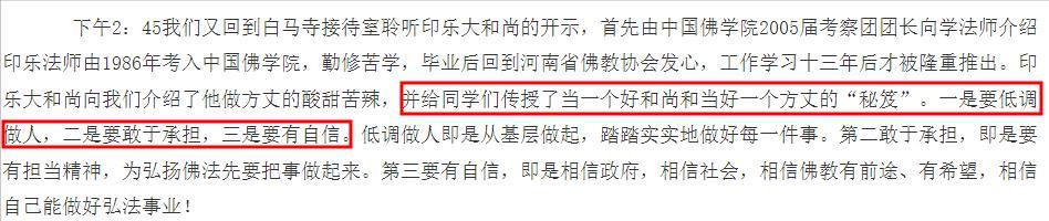 值得一提的是,2009年,印樂法師在白馬寺接待中國佛學院2009屆畢業參學團時,曾和學生們談及當一個好和尚和當好一個方丈的“祕笈”。