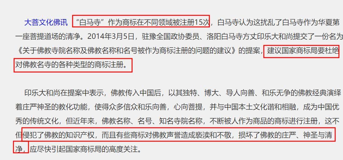 爲此,2014年,印樂法師提交了一份名爲《關於佛教寺院名稱及佛教名稱和名號被作爲商標註冊的問題的建議》的提案,他建議國家商標局要杜絕對佛教名寺的各種類型的商標註冊。
