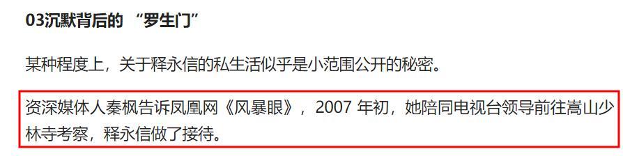 令大家沒有想到的是,在這篇文章中鳳凰網寫道關於釋永信的私生活似乎是小範圍公開的祕密。