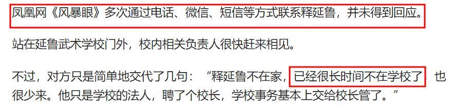 結果在武校,也沒見到釋延魯,反而是武校相關負責人出來見了記者,並告知記者釋延魯不在家,直言他已經很長時間沒有來學校了。