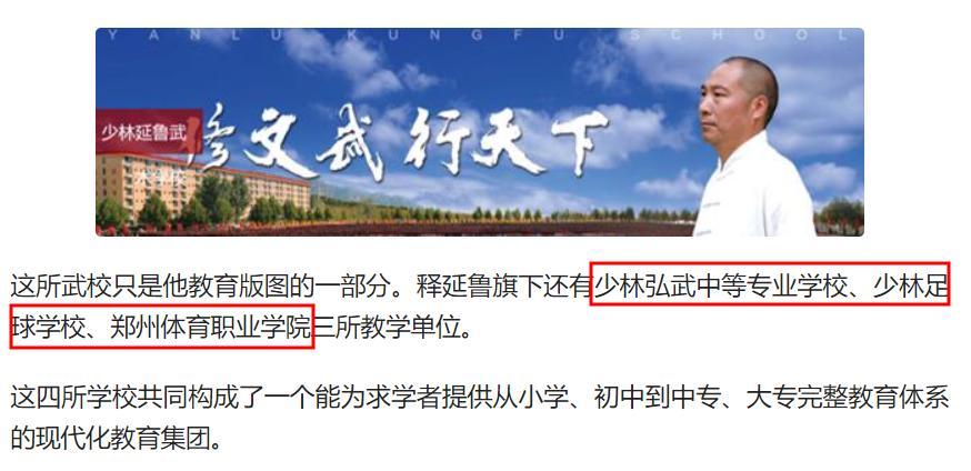 查閱相關資料可知,釋延魯名下除了延魯武術學校,還有少林弘武中等專業學校、少林足球學校、鄭州體育職業學院三所教學單位。