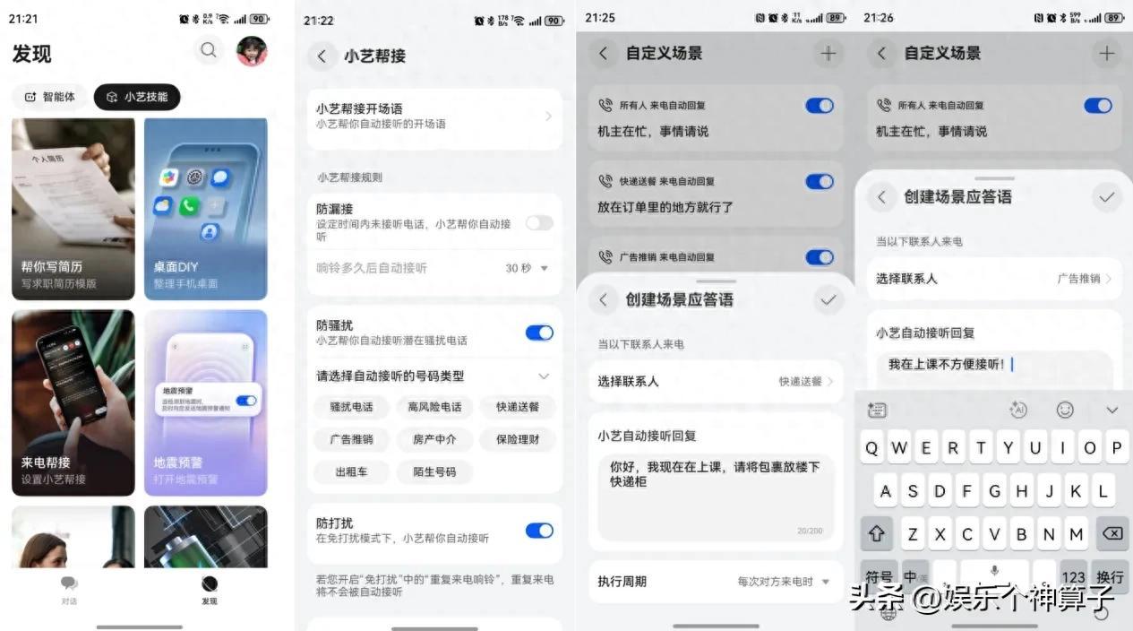 來電幫接可以自定義場景,快遞送餐電話自動回覆:“你好,我現在在上課,請將包裹放樓下快遞櫃”;廣告推銷電話自動回覆:“我在上課不方便接聽!”小藝就像個超級懂我的語音管家,自動識別來電類型,用我設定的聲音和話術去應對,想怎麼回就怎麼回,還能幫我應對各種騷擾電話,這用魔法打敗魔法的體驗,絕對吹爆!