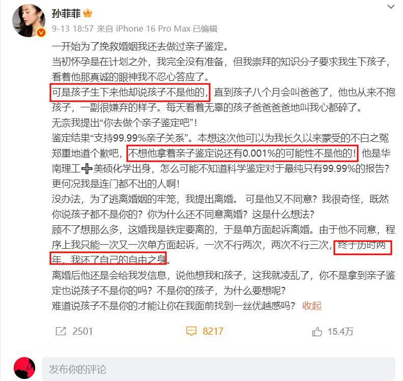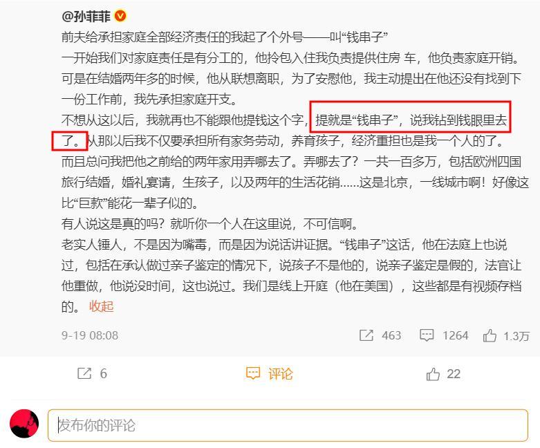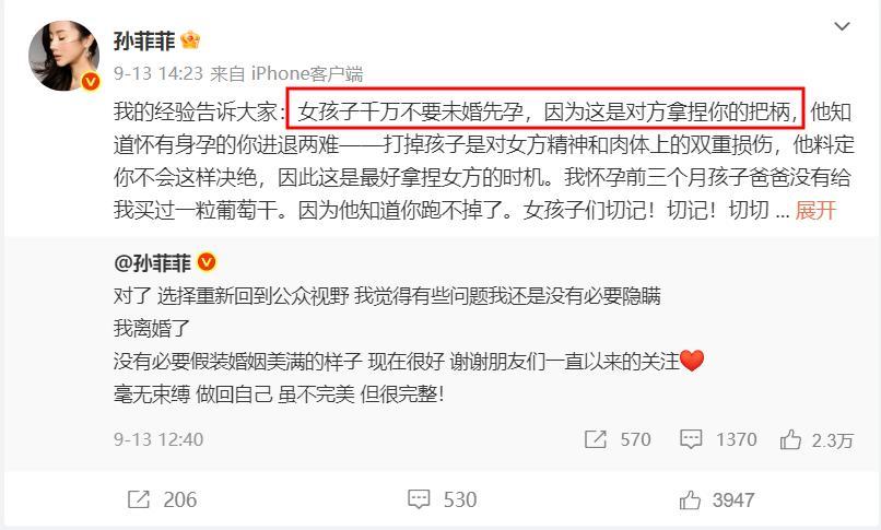 9月13日,孫菲菲官宣與丈夫史宏離婚。