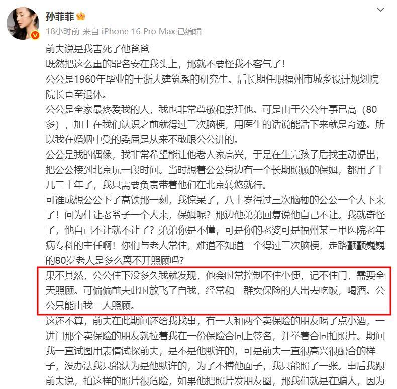 孫菲菲不忍了!回應前夫控訴她害死公公一事,暴露婚內真實處境