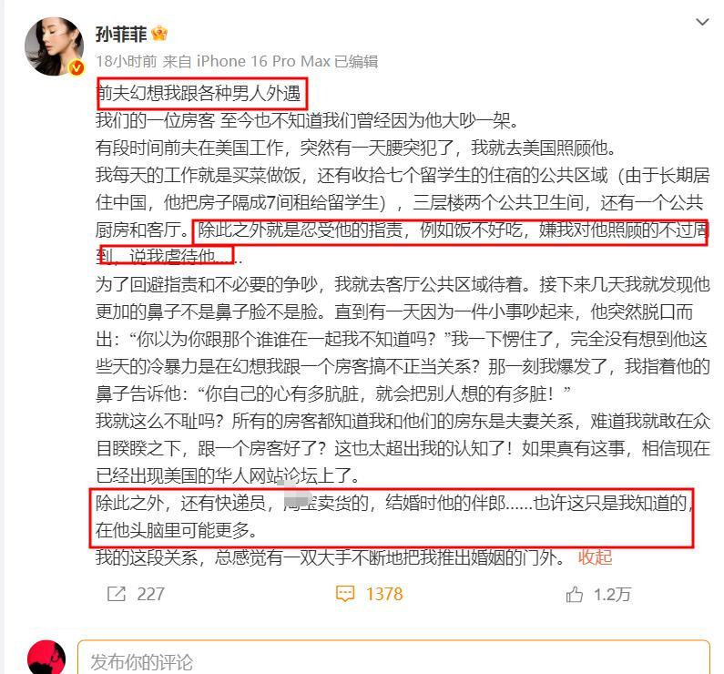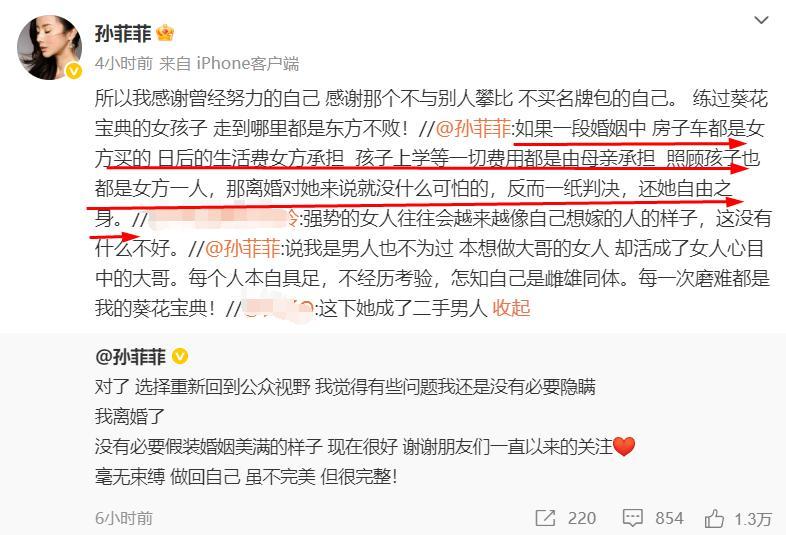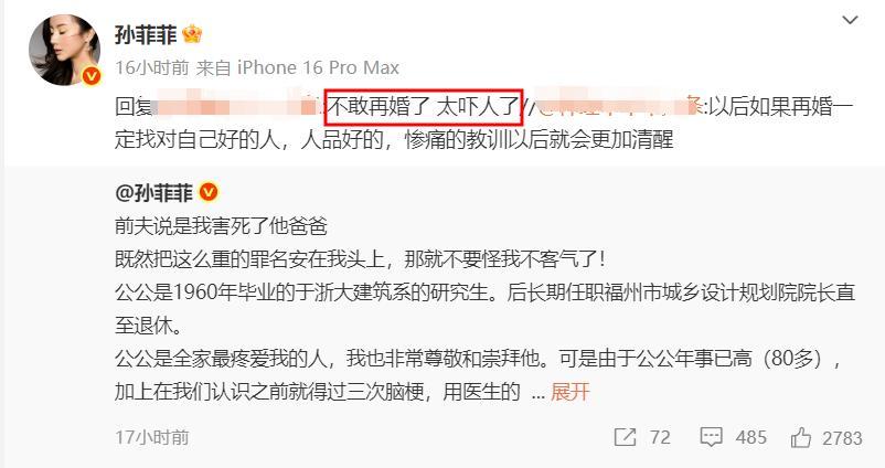 有網友對她說以後再婚要找一個對她好的人,孫菲菲回覆該網友“不敢再婚了,太嚇人了”。