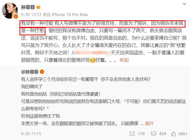 對於此,孫菲菲回應說她發文不是爲了獲得支持,而是傾訴,她說傾訴也是一種療愈。