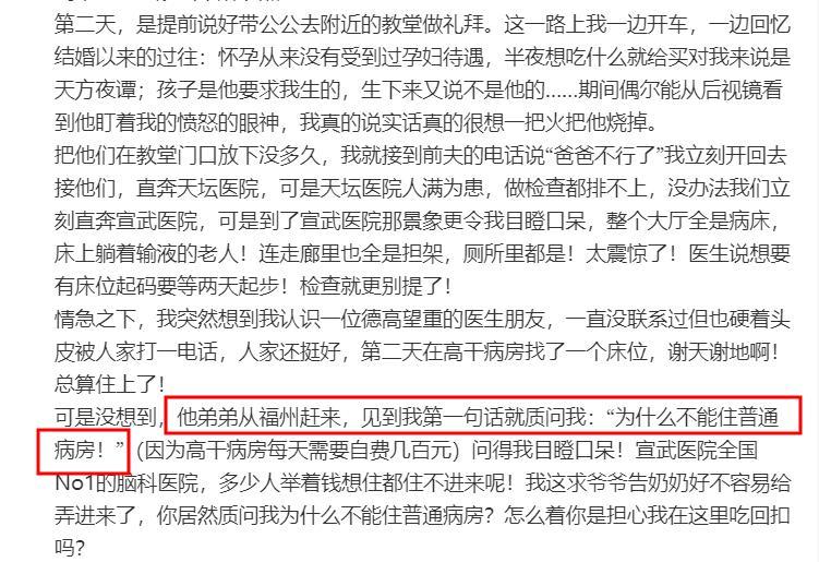 孫菲菲還透露有一次公公病危,她找到一位醫生朋友好不容易在高幹病房弄到一個牀位。結果史宏的弟弟見到她,第一句話竟然是“爲什麼不住普通病房?”