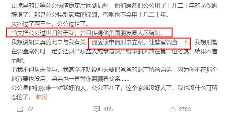 對於此,孫菲菲在文中強調,公公離世一事與她無關,史宏如果認爲是她害死的公公,可以申請刑事立案,讓警察調查。