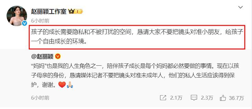 趙麗穎發文後,趙麗穎工作室隨即轉發,並寫道:孩子的成長需要隱私和不被打擾的空間,懇請大家不要把鏡頭對準小朋友,給孩子一個自由成長的環境。