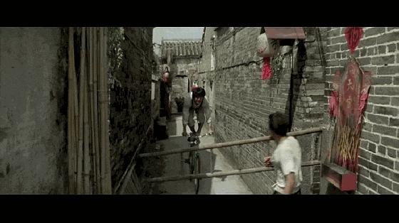 成龍利用狹窄的空間、自行車和自己的肢體,完成了一場既驚險又充滿喜劇感的雜技表演。
