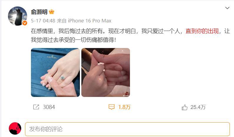 2025年5月17日,俞灝明曬出鑽戒照和拉勾照,並寫道:在感情裏,我後悔過去的所有。現在才明白,我只愛過一個人,直到你的出現,讓我覺得過去承受的一切傷痛都值得!