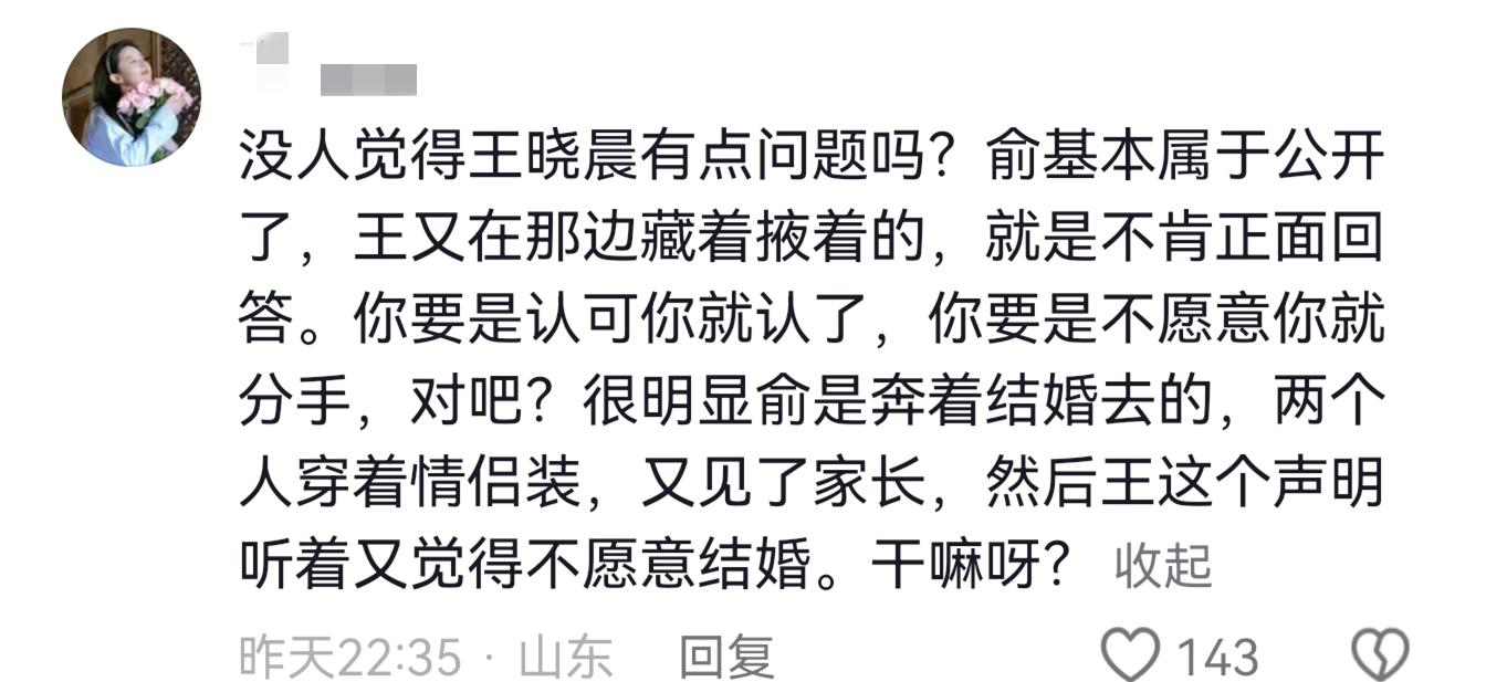 這部分網友能有這樣的想法,也能理解,主要還是俞灝明官宣戀情以來,王曉晨對戀情的回應不夠直接、明確。