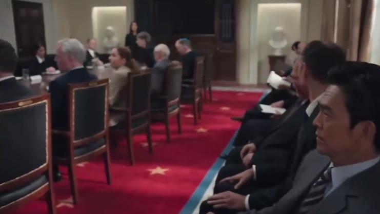 比如劇中會議室的地毯是有黃色五角星的紅色地毯。