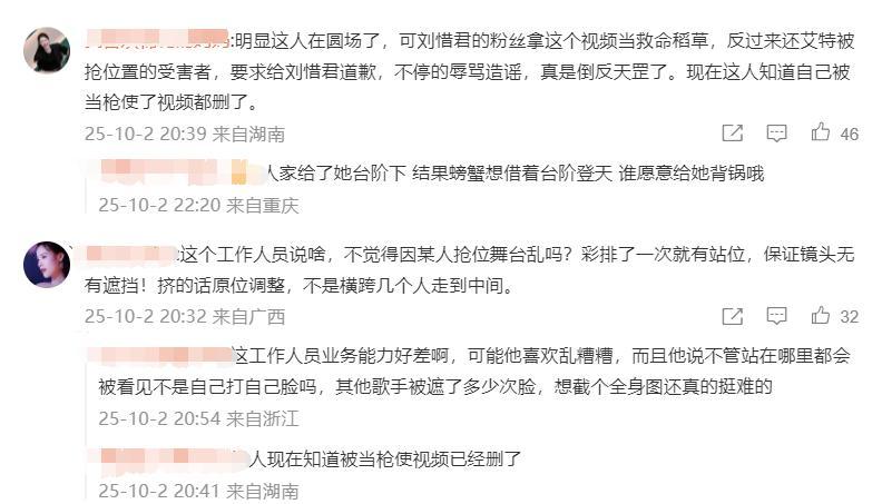 對於此,網友解讀稱該名工作人員發視頻是爲劉惜君圓場,但她的粉絲倒反天罡,讓陳麗君道歉,這使得該功能工作人員意識到被人當槍使了,所以刪除了視頻。