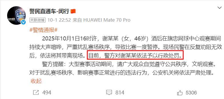 10月1日晚,上海警方就謝女士大鬧球場的事情發佈了警情通報。