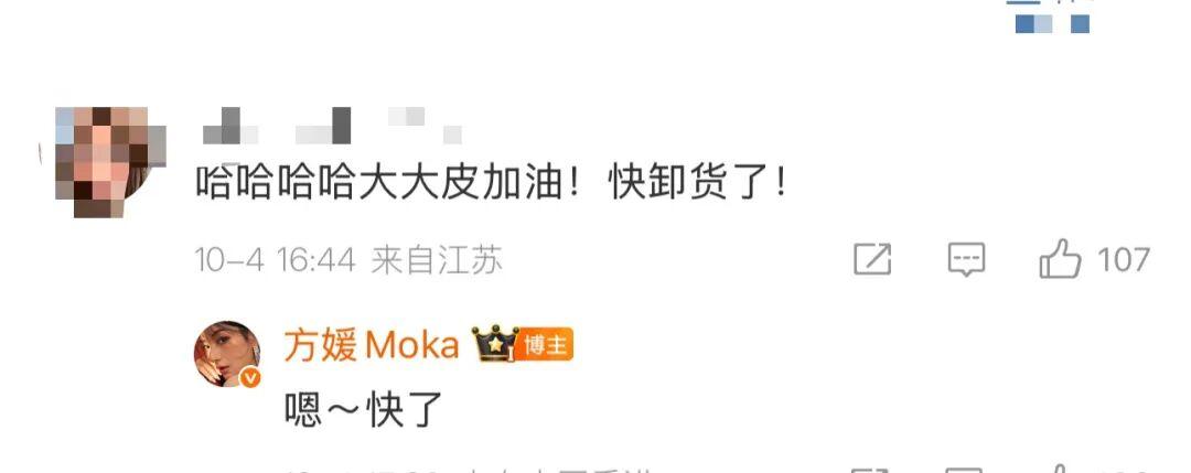 有網友評論“快卸貨了”,方媛回應“嗯~快了”。