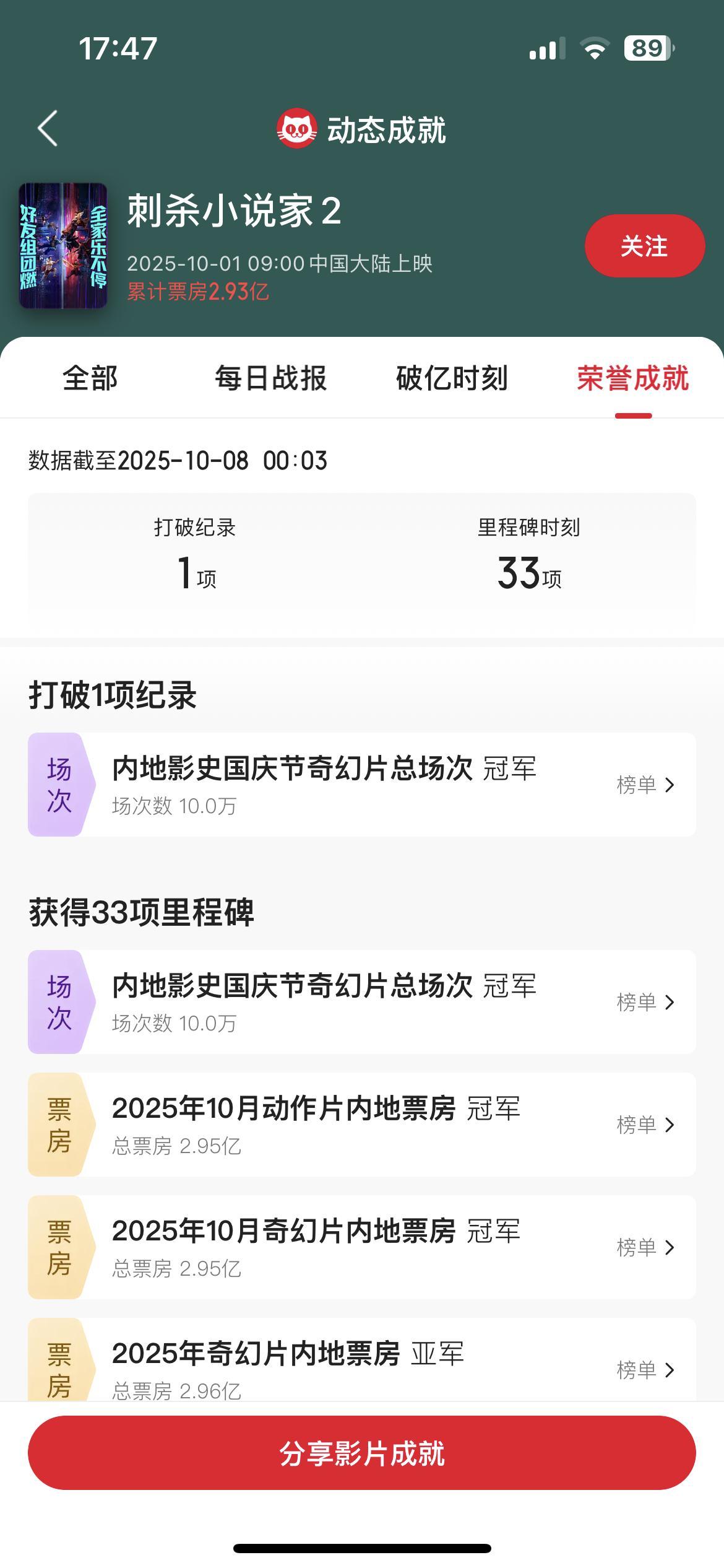 上映至今,已經先後拿下了10月動作片票房冠軍、10月奇幻片內地票房冠軍等33項里程碑成就。