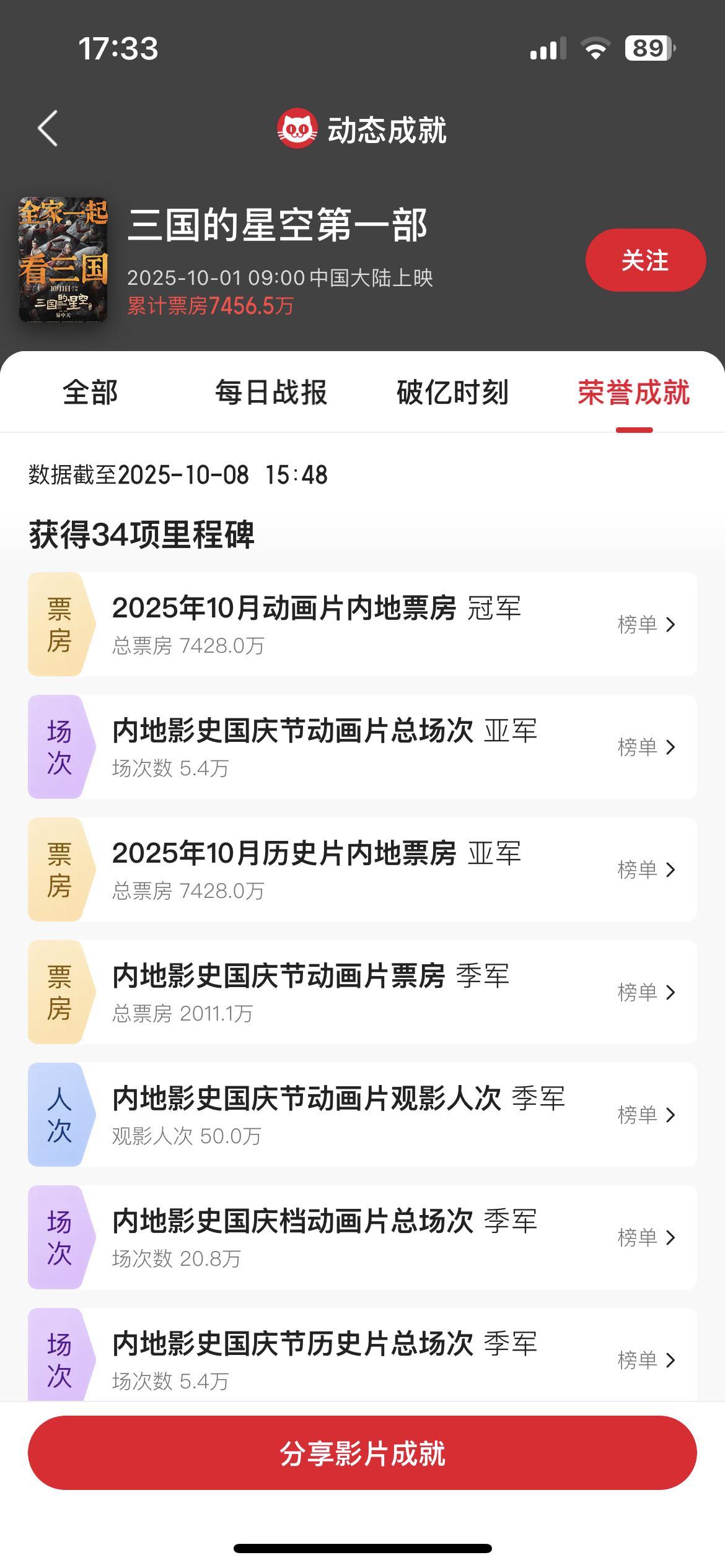目前,國慶檔院線新片的豆瓣評分基本都開分了,《三國的星空》在國慶檔院線新片中口碑不錯,目前已經拿下內地影史國慶節動畫片票房季軍、2025年曆史片內地票房第4名等34項里程碑成就。