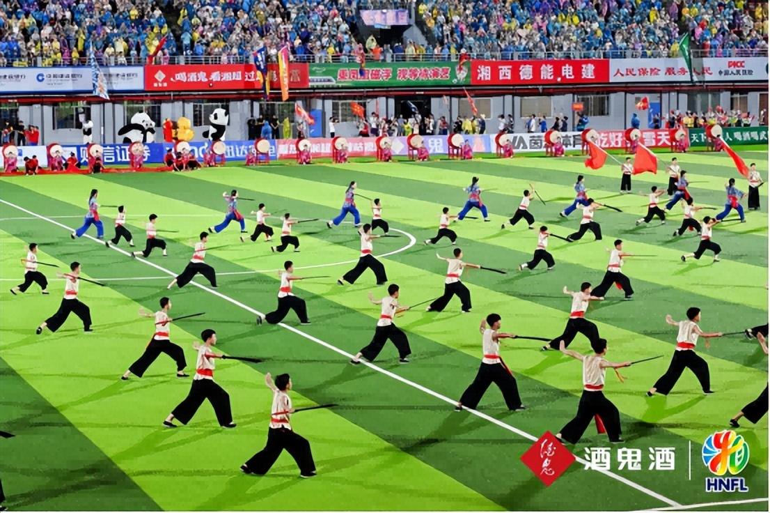 在酒鬼酒冠名的湘西賽區,綠茵場秒變湘人“霸得蠻”的舞臺:苗鼓震天,鼓點裏全是“霸蠻”心跳;國家級非遺“破鋒八刀”,刀鋒劈出“霸蠻”的鋒芒。再配上產自湘西的馥郁美酒——酒鬼酒,濃郁的民族風情撲面而來,讓現場觀衆彷彿置身一場精彩絕倫的沉浸式民族文化博覽,真正實現“看一場球賽,品一方文化”。