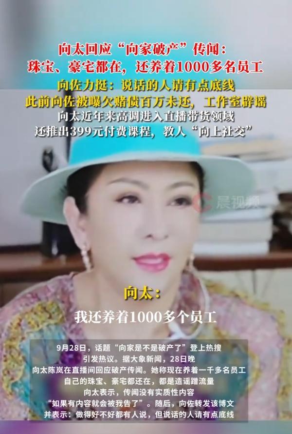 向太在直播時回應稱自己的珠寶和豪宅都還在,還說自己現在還養着1000多名員工,直言網上說向家破產的都是造謠蹭流量。